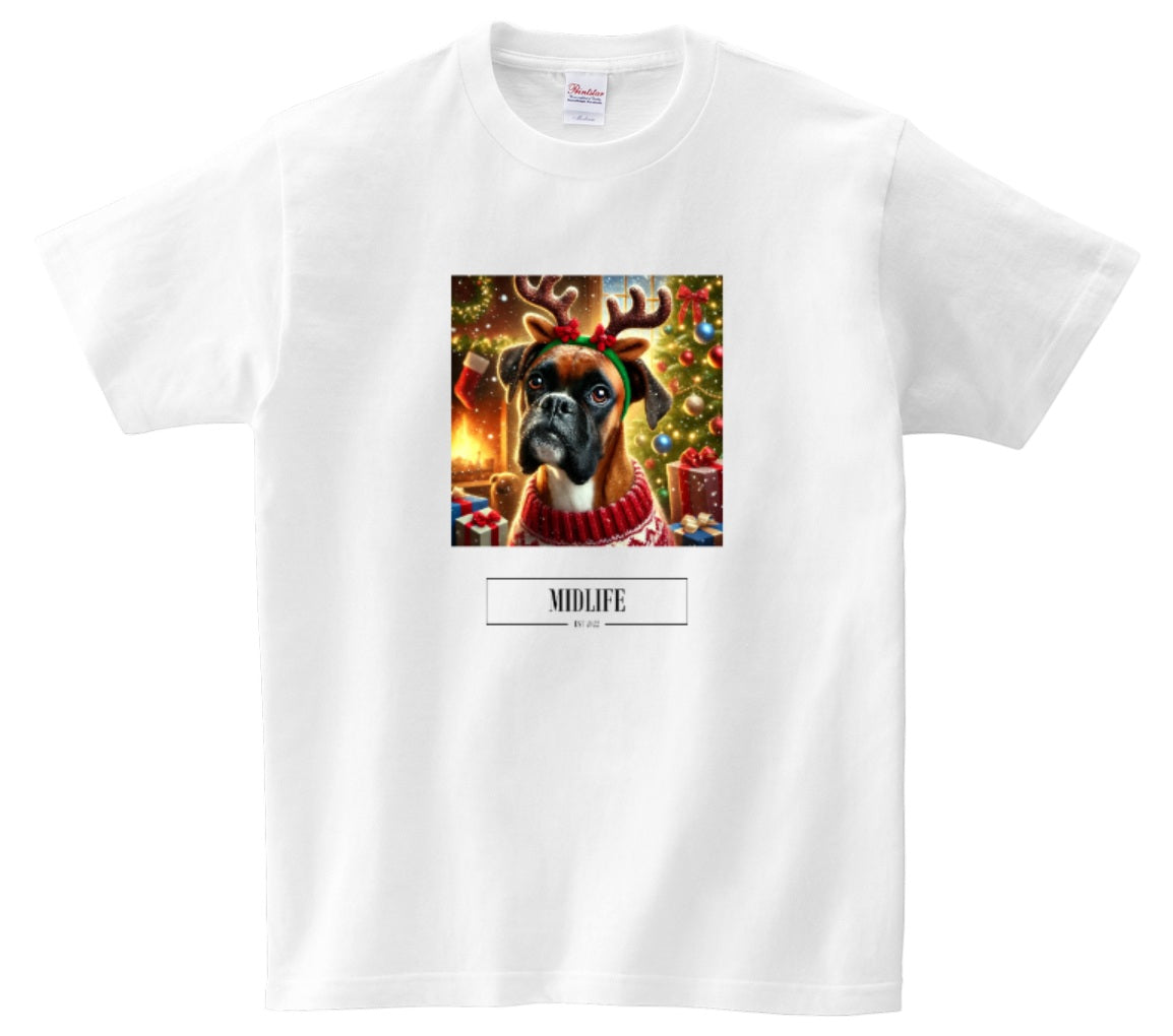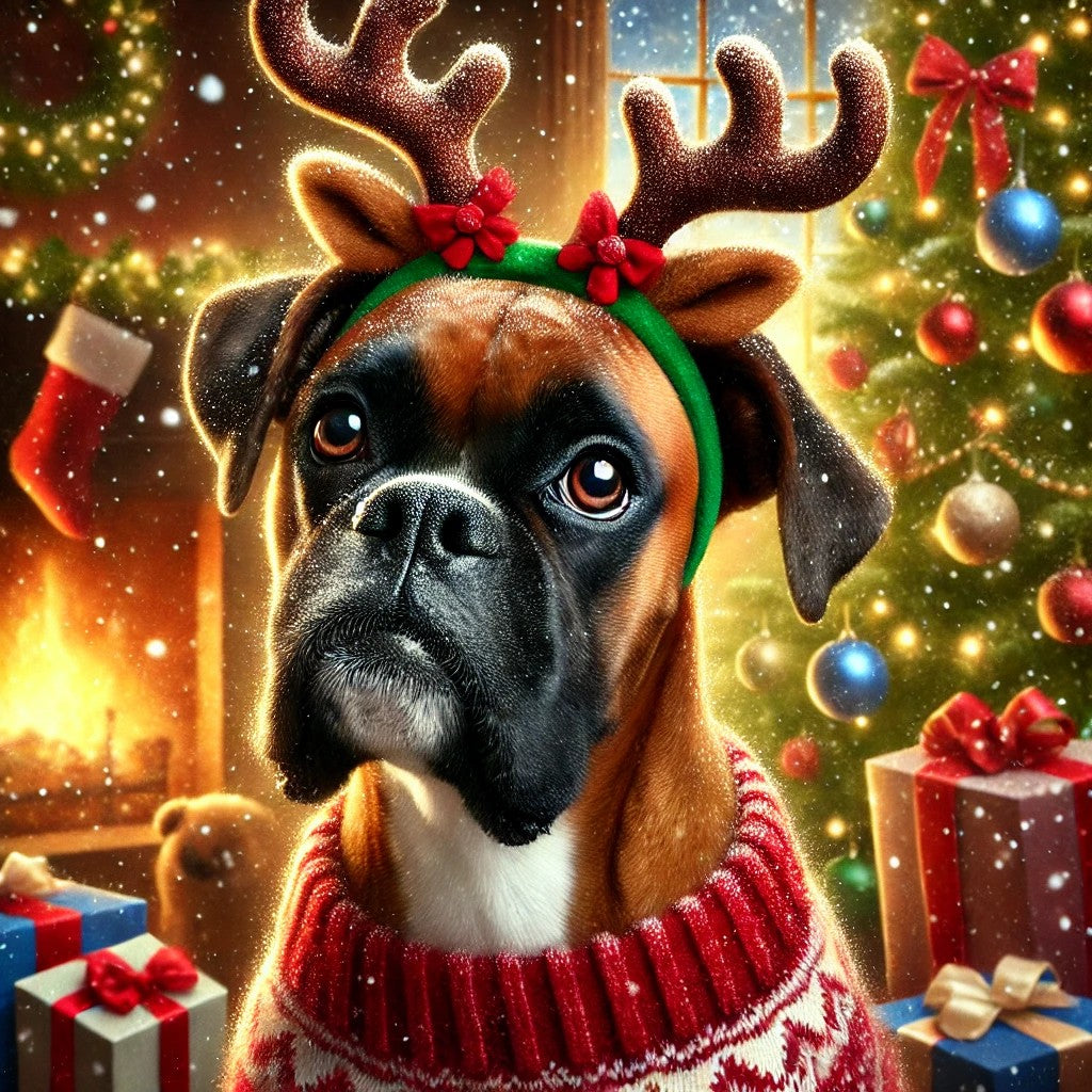 Weihnachten wird niedlich! Dieses T-Shirt zeigt einen treuherzigen Boxer im festlichen Rentier-Look – mit Geweih-Stirnband, rotem Pullover und einem Blick, der Herzen schmelzen lässt. Umgeben von Geschenken, Lichtern und Schneeflocken bringt dieses Motiv sofort Weihnachtsstimmung in deinen Alltag.