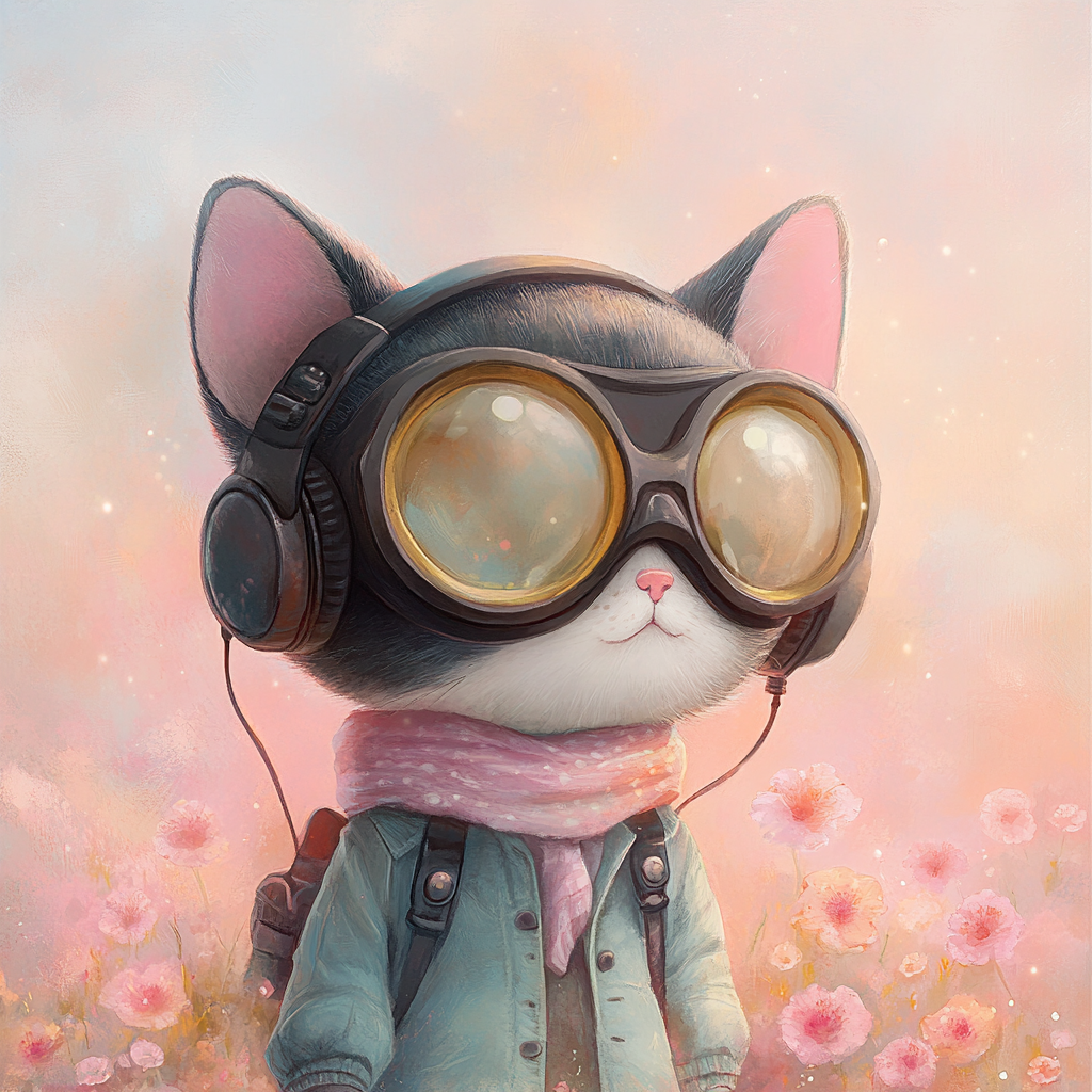 Für alle Tagträumer:innen, Abenteurer:innen und Katzenliebhaber:innen: Diese zuckersüße Katze mit Pilotenbrille, Kopfhörern und kuscheligem Schal steht für Neugier, Style und ganz viel Herz. Der zarte, pastellfarbene Hintergrund verleiht dem Motiv eine märchenhafte Note – ein echtes Statement für gute Vibes und mutige Träume.