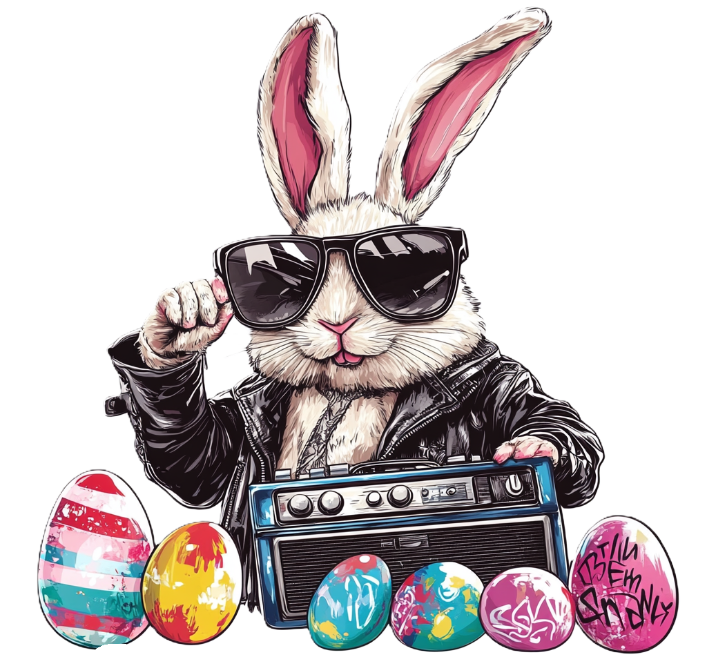 Dieser lässige Hase bringt frischen Style in dein Osterfest – mit Sonnenbrille, Lederjacke und Ghettoblaster ist er der Rockstar unter den Hasen. Umgeben von bunten, grafitti-verzierten Ostereiern mixt er die perfekte Kombi aus Feiertag und Streetstyle.