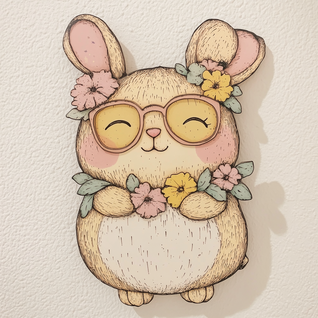 Mit einem fluffigen Häschen im Retro-Stil, das mit großen Sonnenbrillen, Blütenkranz und einem breiten Lächeln durch deinen Alltag hoppelt.