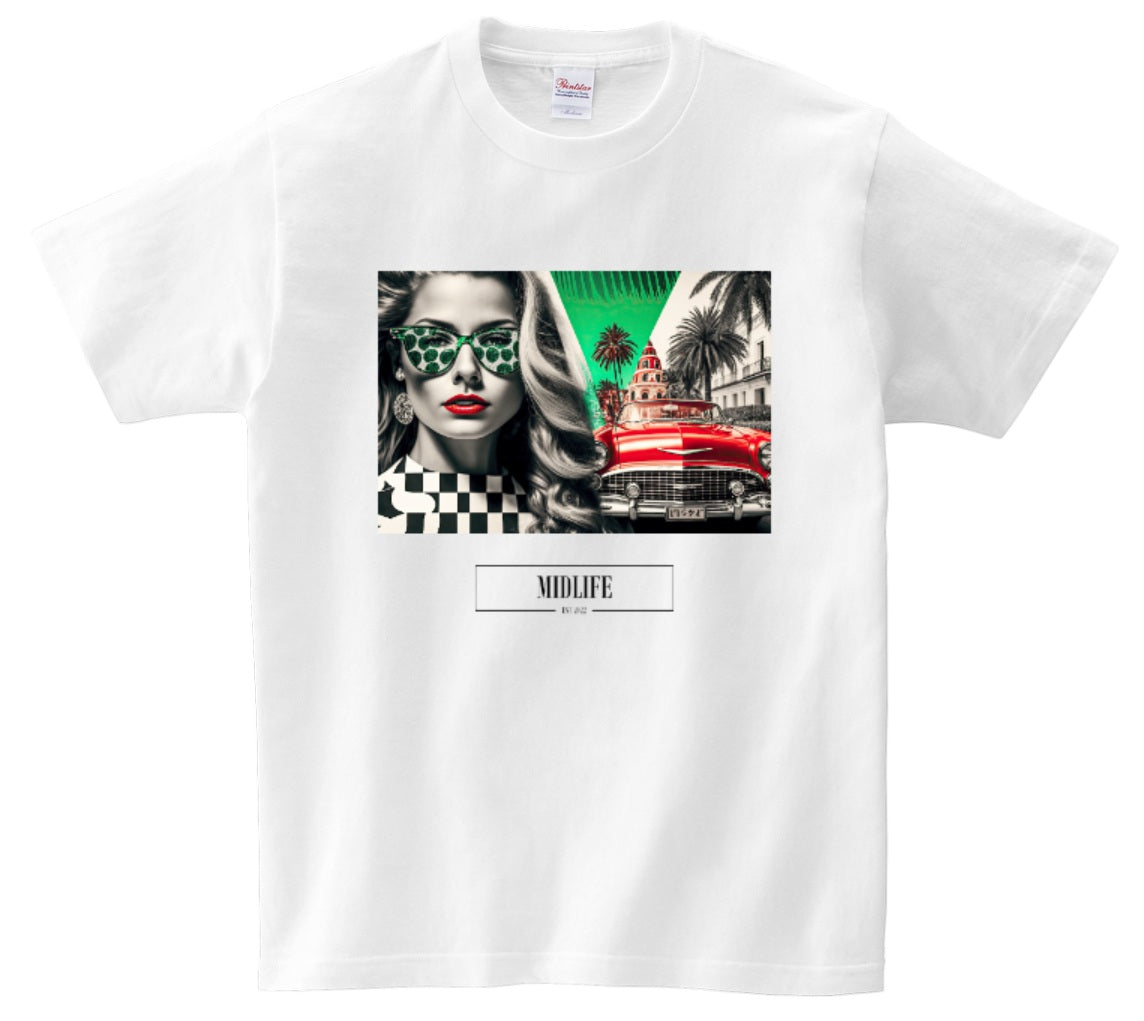 Tauche ein in das goldene Zeitalter der Coolness! Das „Wonda“ T-Shirt vereint den ikonischen Look der 60er mit modernem Streetstyle: Eine stilvolle Diva mit Polka-Dot-Sonnenbrille trifft auf einen knallroten Oldtimer vor exotischer Kulisse – pure Eleganz mit einem Hauch Nostalgie.